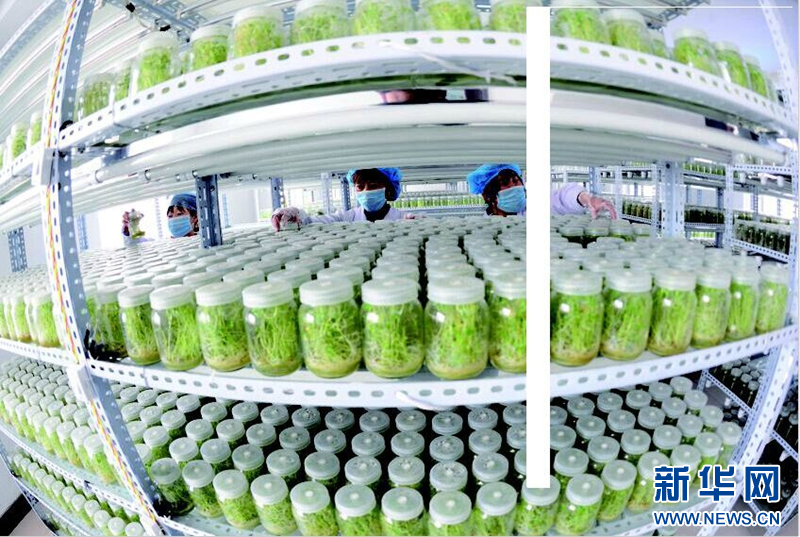 在康農薯業(yè)有限公司里,一株株小拇指長短的青苗生機勃勃。技術人員輕捏滴管,將脫毒制劑滴入培養(yǎng)皿中,觀測記錄馬鈴薯脫毒種苗的生長情況。