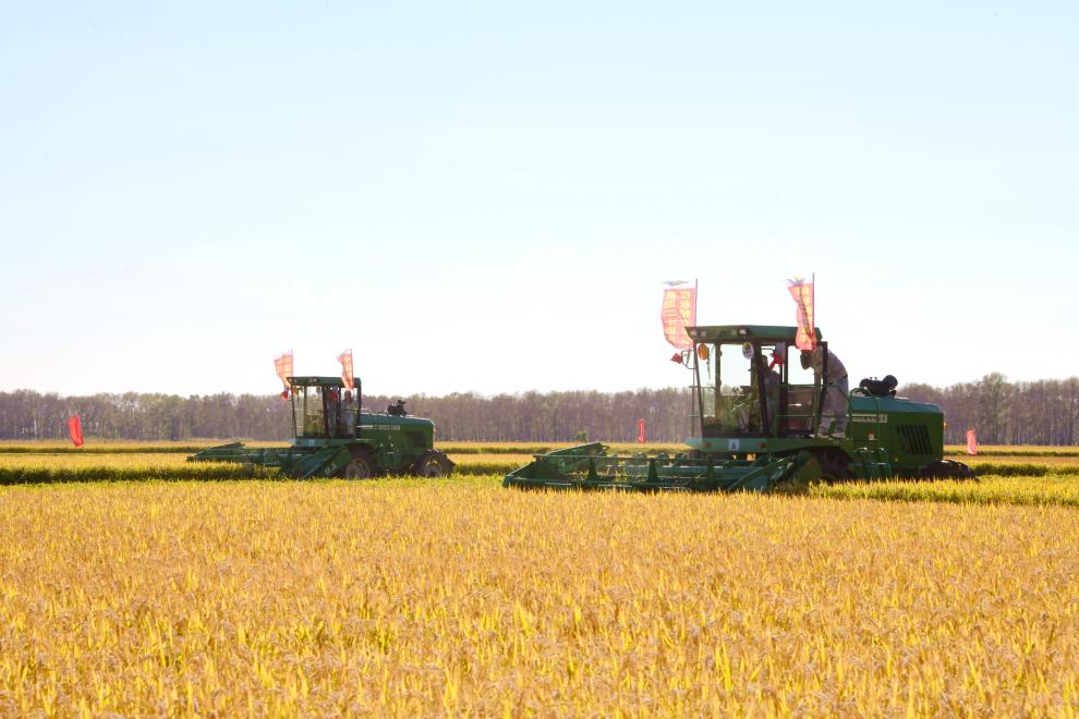 北大荒集團普陽農(nóng)場有限公司第三管理區(qū)水稻種植綜合標(biāo)準(zhǔn)化示范區(qū)的割曬機分段收獲現(xiàn)場。(李道民 攝)