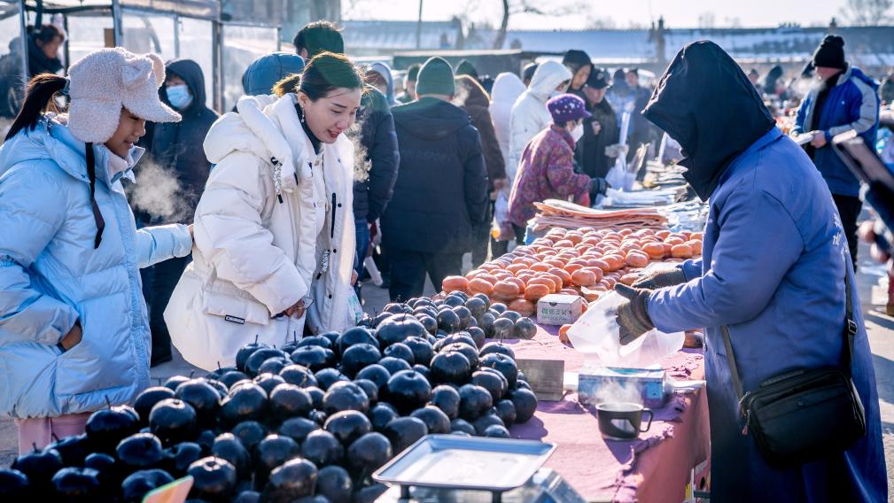 顧客在吉林省長春市近郊的卡倫大集上購買凍梨和凍柿子(1月18日攝)。新華社記者 唐成卓 攝