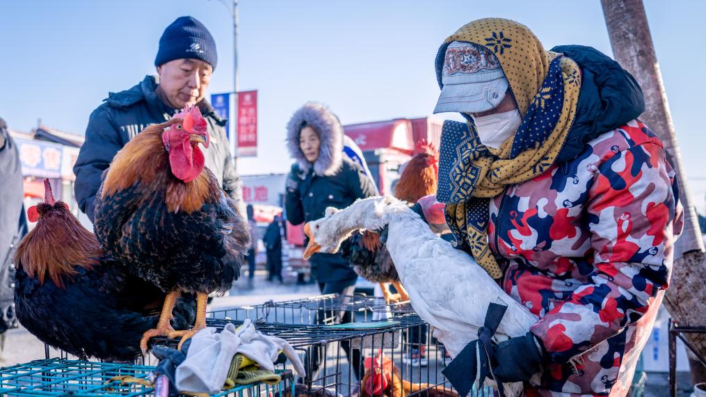 “凍梨凍柿子嘞,嘎嘎甜,不甜不要錢”“冰糖心蘋果賤賣嘍,3斤10塊”“排骨18塊1斤,棒骨8塊1斤”……臨近年關,吉林省長春市近郊的卡倫大集上,人群摩肩接踵,叫賣聲此起彼伏。這個中國東北農村集市年味漸濃。