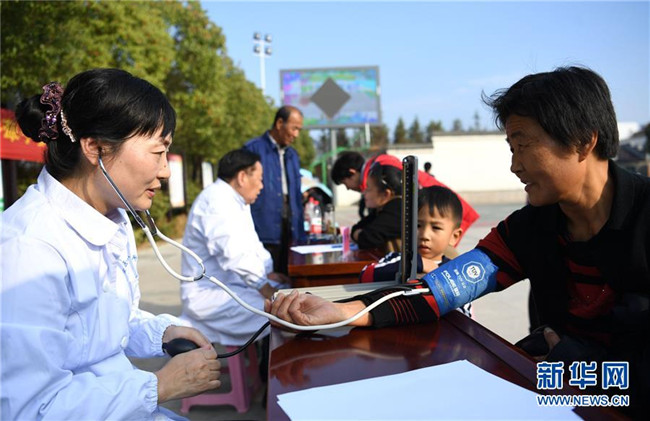 11月4日,安徽醫(yī)科大學(xué)第一附屬醫(yī)院的醫(yī)生為村民體檢。 當(dāng)日,安徽省肥西縣豐樂鎮(zhèn)邀請安徽醫(yī)科大學(xué)第一附屬醫(yī)院的醫(yī)生來到鄉(xiāng)村,免費(fèi)為周邊村民提供醫(yī)療咨詢、健康體檢、醫(yī)療保健等衛(wèi)生服務(wù)。新華社記者劉軍喜攝 11月4日,安徽醫(yī)科大學(xué)第一附屬醫(yī)院的醫(yī)生為村……